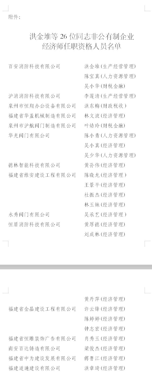 接泉州市职称改革领导小组《关于批准确认蔡长江等147位同志非公有制企业经济师任职资格的通知》(泉职改〔2021〕41号)文件通知,批准确认由第九届泉州市非公有制经济组织经济系列中级专业技术职务评审员会评审通过的李莲清等26位同志非公有制企业经济师职务任职资格,任职资格确认时间为2021年6月12日。具体名单详见附件。